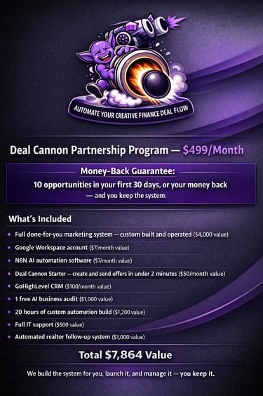 Deal Cannon is a done-for-you marketing system that generates inbound creative finance opportunities with realtors and uses AI to eliminate 90% of the admin work involved. This allows our partners to stay focused on follow-up and closing.